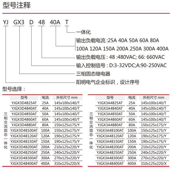 技術(shù)參數(shù): 1. 本模塊規(guī)格不同其外形安裝尺寸各有不同,選型時對照規(guī)格設(shè)計留有安裝空間。 2. ?祀娏饕(guī)格選用應(yīng)考慮到電網(wǎng)電壓的波動和負(fù)載啟動時的瞬間電流沖擊, 環(huán)境條件, 散 熱條件因素,建議留有適當(dāng)余地. 為確保模塊長期可靠工作, 建議: 阻性負(fù)載: 選擇模塊的電流容量是實際工作電流的3-4 倍; 感性負(fù)載: 模塊標(biāo)稱電流應(yīng)為負(fù)載實際電流的5- 6倍; 3. 過壓過流保護(hù): 在?燧敵龆瞬⒔( 電壓800-900V) 壓敏電阻可有效的過壓保護(hù), 主回路 串接快速熔斷器或斷路開關(guān)作為過流保護(hù), 取值為實際負(fù)載電流的1.5 倍。 4. 本模塊用戶可以直接選擇一體化型, 安裝簡單使用方便, 60A 以上配有風(fēng)扇強(qiáng)冷, 以利模 塊有效散熱, 防止模塊因溫度過高燒壞電子元器件或擊穿芯片。 5. 當(dāng)容性負(fù)載時,禁止使用此件, 請選擇容性負(fù)載專用固態(tài)繼電器模塊組件。