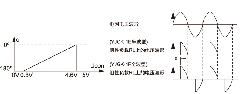 Control voltageucon and thyristor output conduction angle α curve (resistive load) and waveform diagram: